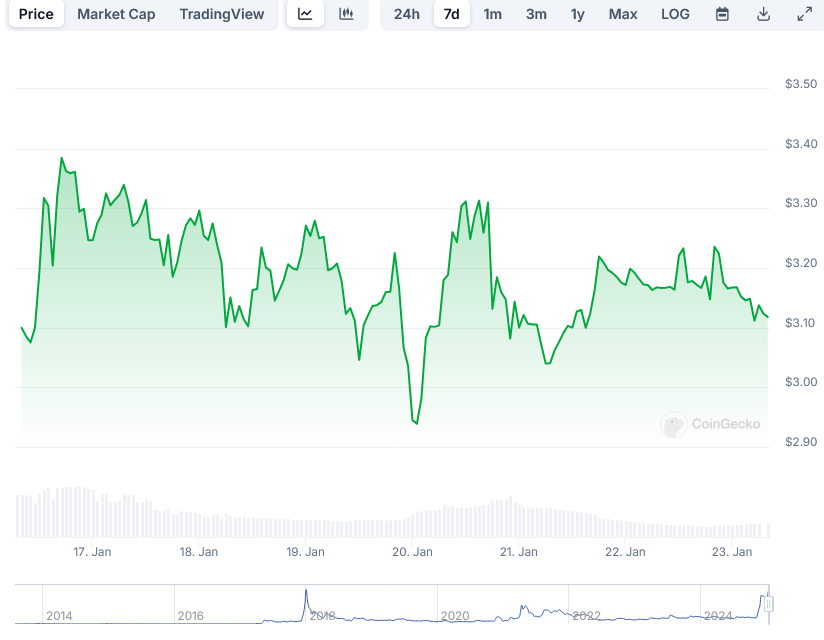 The cryptocurrency has tested the $3.24 level multiple times, facing rejection. CasiTrades suggests that consolidation between $3.24 and $3.33 might occur before a potential breakout, emphasizing the need for a new high to confirm the $3.80 target.