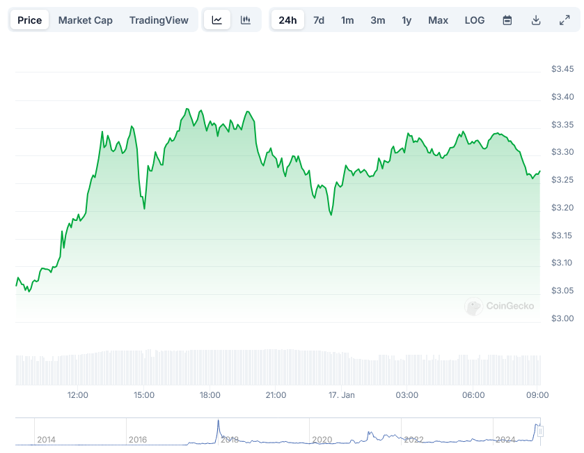 The token’s price action shows strength above the $3.00 level, with current trading occurring above both the $3.20 mark and the 100-hour Simple Moving Average. A bullish trend line has formed with support at $3.15 on hourly charts.