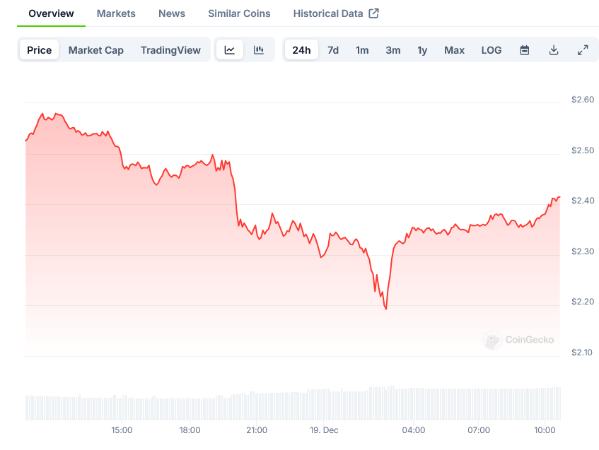 Current chart analysis reveals attempts to break through the $2.50 resistance area, with price action showing repeated tests of this level. The seven-day performance shows an 8% increase as the asset consolidates recent gains.